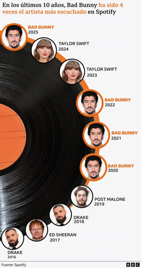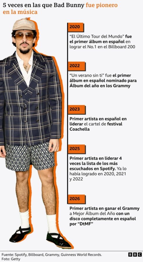 Su carrera dio un salto histórico cuando se convirtió en el primer artista en ganar un Grammy a Mejor Álbum con un disco completamente en español, gracias a “Debí Tirar Más Fotos”. Ahora, a sus 31 años, encabeza el show del medio tiempo del Super Bowl LX 2026, uno de los espectáculos más vistos a nivel mundial, con más de 120 millones de espectadores potenciales.