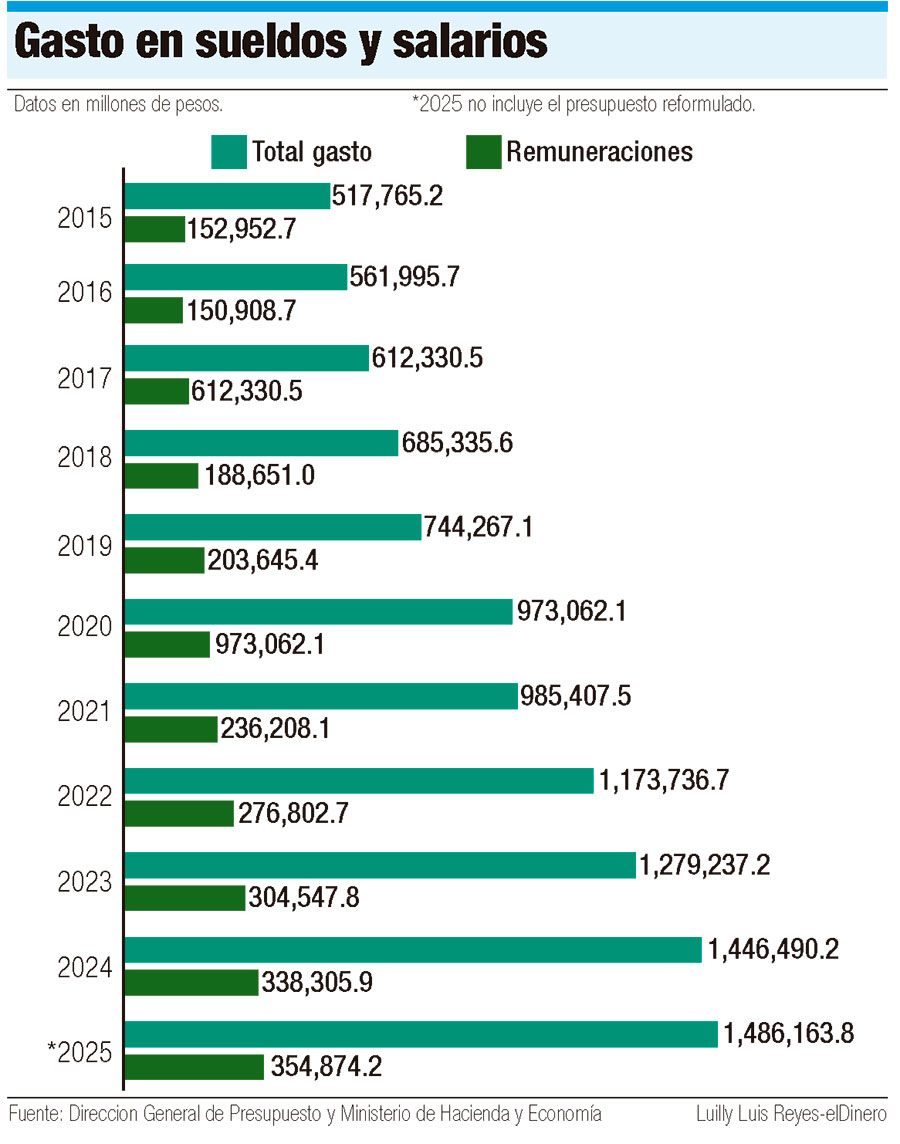 El gasto en remuneraciones, es decir, sueldos y salarios, pasó de RD$152,952.7 millones en 2015 a RD$338,305.9 millones en 2024, para un incremento neto de RD$185,353.2 millones, equivalente a un crecimiento del 121.2%. Para este 2025 hay presupuestados RD$354,874.2 millones y para el 2026 el panorama luce similar. De acuerdo con el proyecto de Ley de Presupuesto General del Estado depositado en el Congreso Nacional, el mayor gasto del Gobierno dominicano en 2026 correspondería a las remuneraciones a empleados públicos, que representarían el 23.2% del total, equivalente a RD$376,964 millones.